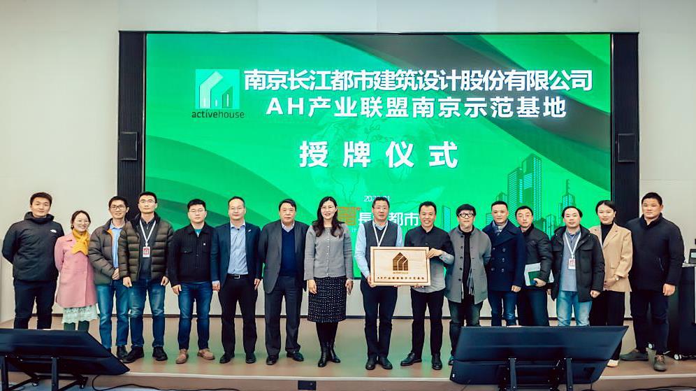 “AH产业联盟南京示范基地”授牌仪式在南京长江都市建筑设计股份有限公司智慧总部大楼举行,Active House 中国创始人、欧盟商会建筑委员会主席、威卢克斯(中国)有限公司总裁赵金彦为長江都市授牌。