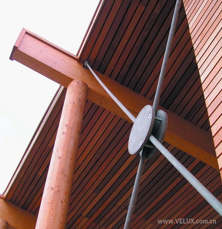 沿着建筑的每个中心轴,两块结实的木柱支持着南北两端耸立的屋顶。