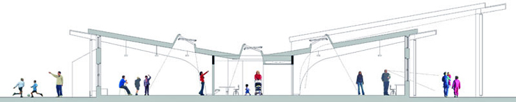 图解:从北面观察, 虽然建筑立面采用了一系列相近的建筑方式,但是却呈现出不同的特性。所有教室的两排窗户中都有光线射入,其中一排窗户位于视平线位置,另外一排则位于屋顶天窗。小小的门斗既可以作为紧急出口,也能够扩展教室的使用面积。