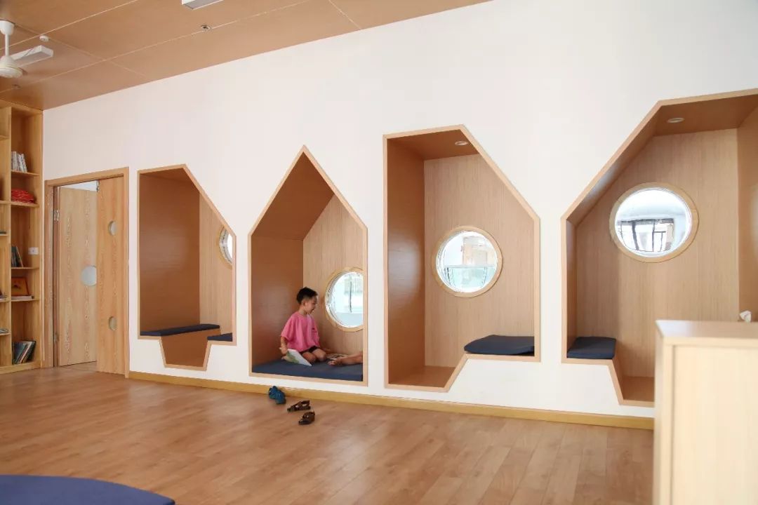 在专业活动室的设计中,包括阅读教室、烘焙教室等,设计师为了将教学需要用设计语言表达出来,采用了情景化设计,充分利用狭小空间,将不同的元素融入到特定空间中去,在丰富的教学、游戏与交流活动的空间里,让孩子们尽情享受着体验、探索、发现的乐趣。