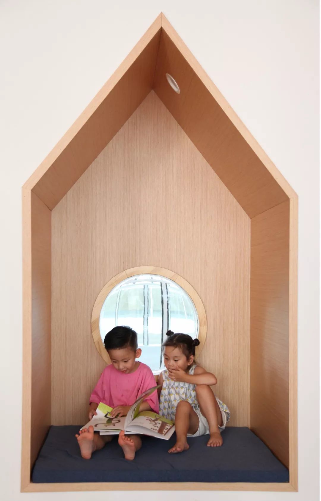室内材料以简洁的木材为主,营造了一个轻松活泼的氛围。局部装饰圆形窗洞活跃氛围为孩子们构建了恣意玩耍的惬意环境。孩子们在这里可以嬉戏休息、交流学习。