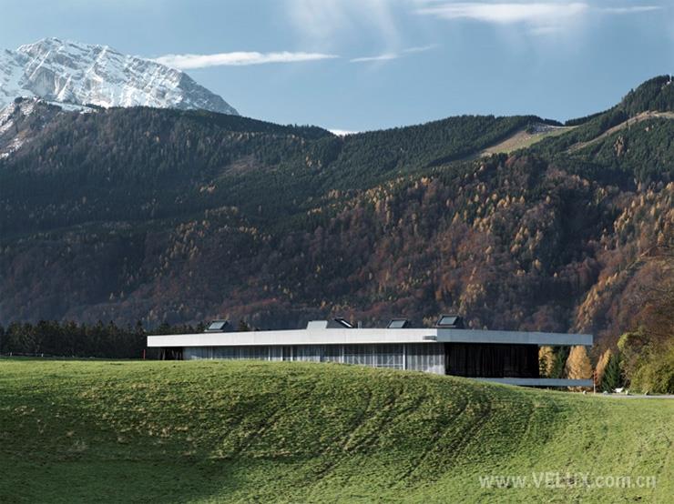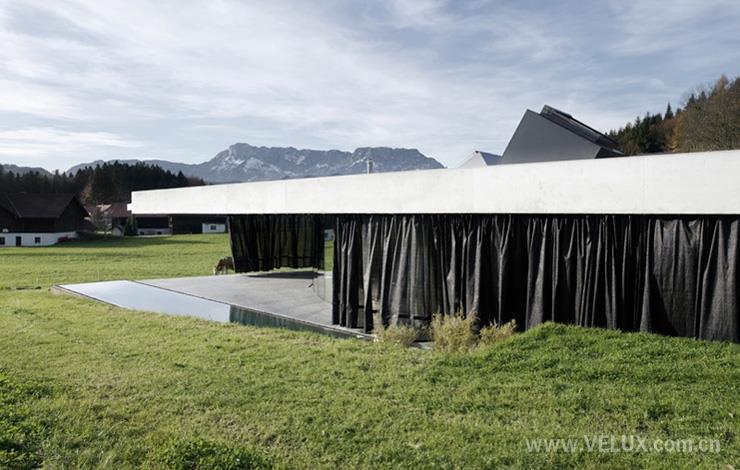 从远处路边观察47o40´48”N/13 o 8´12”E,这栋建筑仿佛是被人不经意间平整地摆放在山脚的草坪上。建筑表面的质朴简洁掩盖不住建筑师深思熟虑后的精心设计:整栋建筑是一个不规则的几何立方体,房屋使用的都是未经处理的混凝土天花板以及沥青砂胶地板,这使建筑、周围的景色柔和的融为一体。平直的屋顶上点缀着倾斜的天窗,那是光的通道。房屋南面房屋下沉了大约1米;北面则高出地面大约8米。