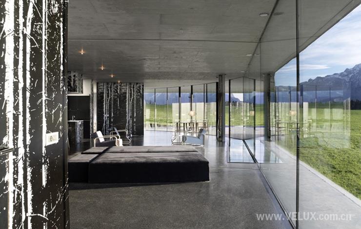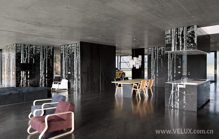 内部遵循极简主义原则,阳光几乎只能够从起居室的一侧照射进来,方盒子的其中五间(三个浴室,一个衣帽间,一个厨房)通过威卢克斯的天窗进行自然采光。顶部天窗照射进来的阳光,弥补室内日光的不足。