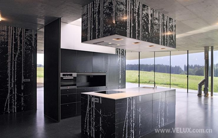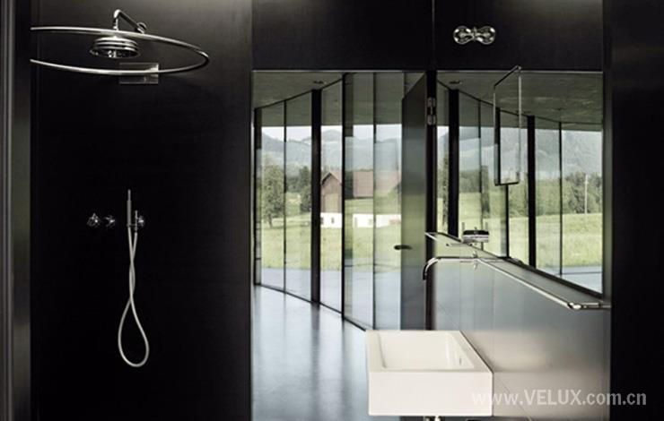 威卢克斯天窗在屋顶上创造了阳光的通道,安装角度倾斜于水平面30度,凸起的部分为房屋外部轮廓增加了活力和趣味性。建筑师针对室内功能的不同,精心的设计不同倾斜方向的天窗。浴室的天窗朝向东面捕捉清晨的日光;衣帽间的天窗朝向北面,以避免房间过热;厨房顶部的天窗,面向西侧能够接受到落日的余晖。此设计不仅解决了跨度较深及黑暗的功能空间的采光问题,同时营造出室内柔和温暖的光影效果。所有天窗均由威卢克斯智能电控系统通过设定程序实现自由控制。大约300平方米的玻璃墙将室内和室外分隔开来,取代了阻隔视线的墙面,成为名副其实的“看得见风景的房间”。