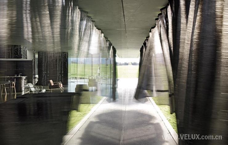 窗帘沿着屋顶边缘垂挂下来,随风飘动,随着光影的变化和折射,给房屋增添了灵动的色彩。建筑的黑色外表赋予了室内一种特殊光感。整栋房子里演示着不同的日照变化,创造了不同的景色和透视图。黎明或傍晚,当太阳低于水平面时,光线会透过厨房的天窗直接射入,为室内带来温暖的气氛。