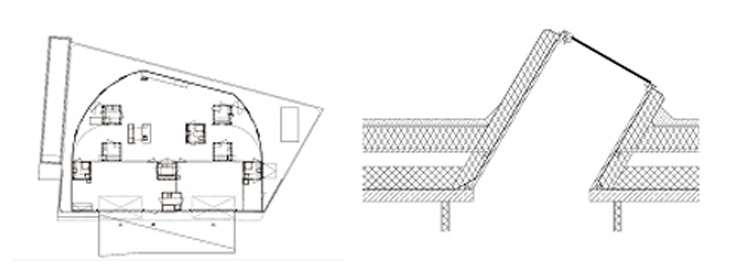 西北角长达八米巨大的悬臂,是屋顶结构设计的重要因素。由于结构有可能下沉和产生塑性变形,因此让混凝土底面裸露的决定是具有一定挑战性的。面对如此大的跨度建筑师使用了倒置复合屋顶体系:这是一张钢筋混凝土加压板,通过埋头螺栓悬挂在型钢梁构成的框架上。钢框架由方钢管柱支撑,钢柱分布在核心筒的外角和直线形立面处。在核心筒墙体内的交叉支撑加强了建筑的立平稳定性。