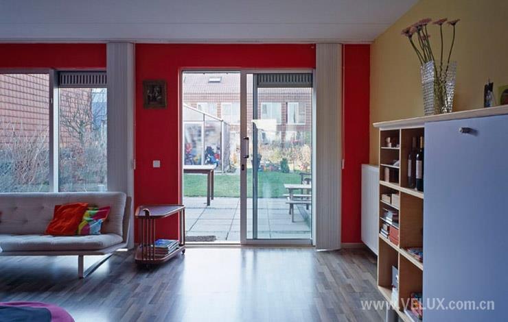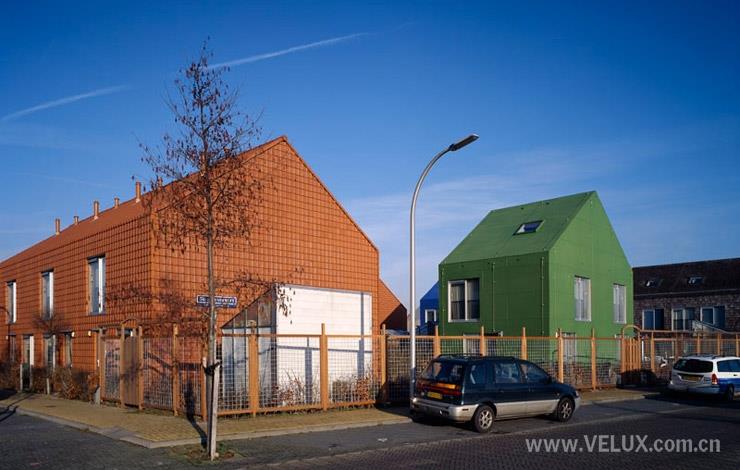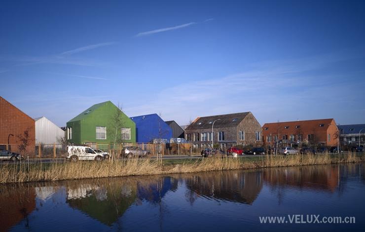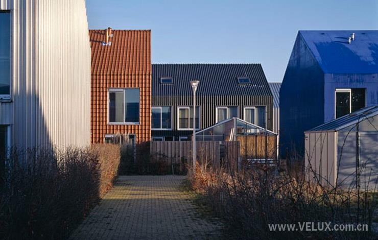 每排房最多包括六栋独立住户,零星散布的布局从多个角度呈现着哈根尼兰德村落的独特外貌。安装于屋顶的威卢克斯天窗,引导更多的日光进入室内,温暖的日光照射在不同的环境中,变幻营造着不同的温馨。