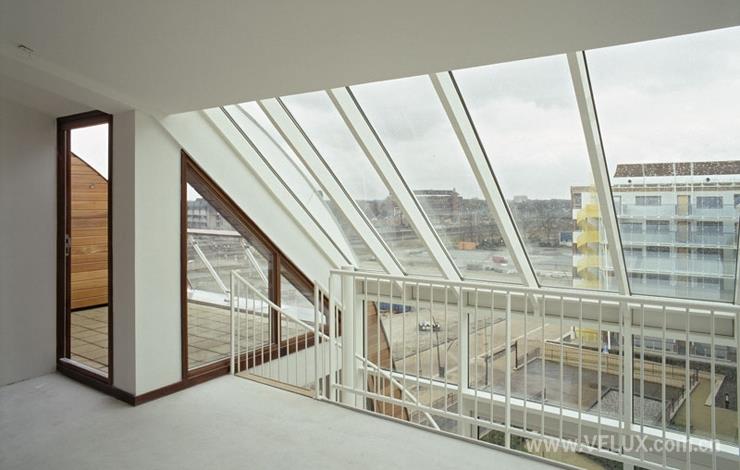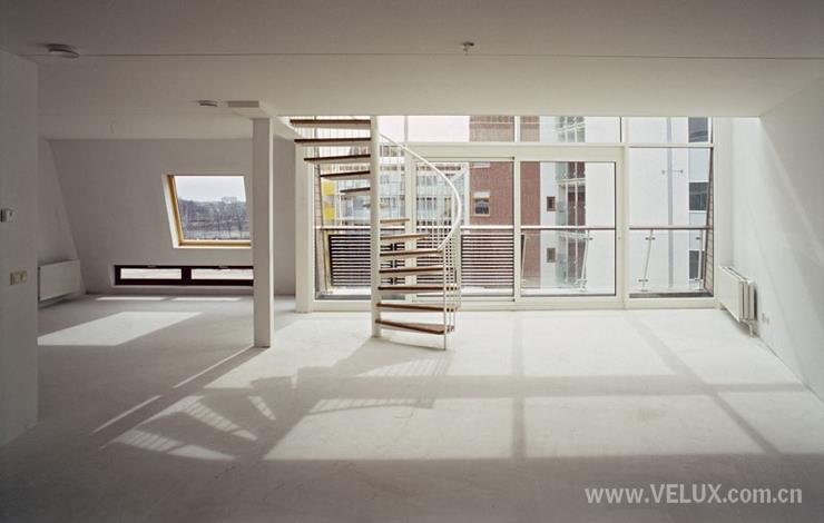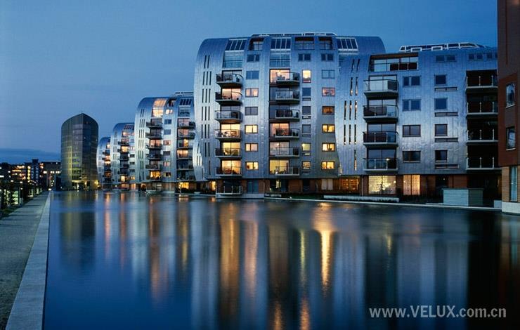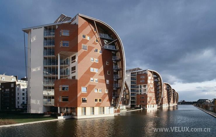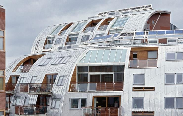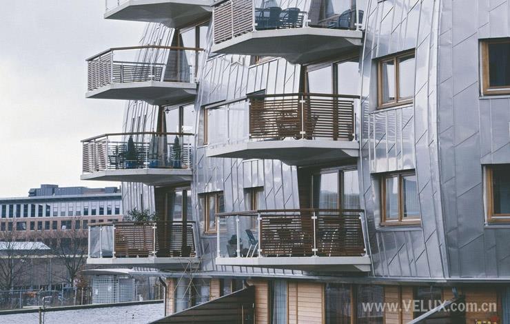 不锈钢材料做成的弯曲表面,及威卢克斯窗与建筑弧形面更好地契合,构成了现实中最理想的完美画面。 弧形屋面上的威卢克斯窗增加采光通风面,再加上每一套房子独立、突出的木栏杆阳台,创造了一系列向阳的角度,使在每套公寓里的人们都拥有一方蔚蓝的天空。每当阳光明媚天气宜人的时候,户外活动和在阳台上用餐成为一件非常愉快的事情。