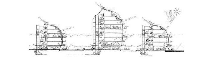 号称“海上的马车夫”的荷兰引用“航行”这一理念,使得这些建筑犹如在人工整齐的河道上扬帆航行的舰队。这种设计的目的是希望用河水围绕这些小的花园空间,既要减少海风的吹袭,而且要让每个房间充满阳光,这不仅是居住者私有空间的问题,还涉及到社会的规划理念问题。尤其是在荷兰这样国土珍贵的国家,私有空间是十分重要的,人们居住空间距离很近,半遮拦的冬季花园可以使得邻居们更愉快的交流,也更方便了孩子们玩耍。