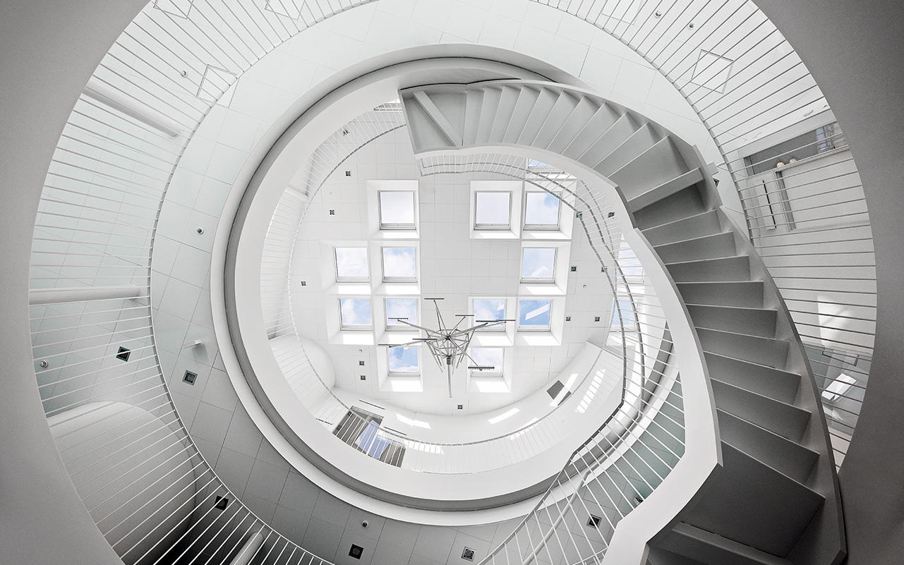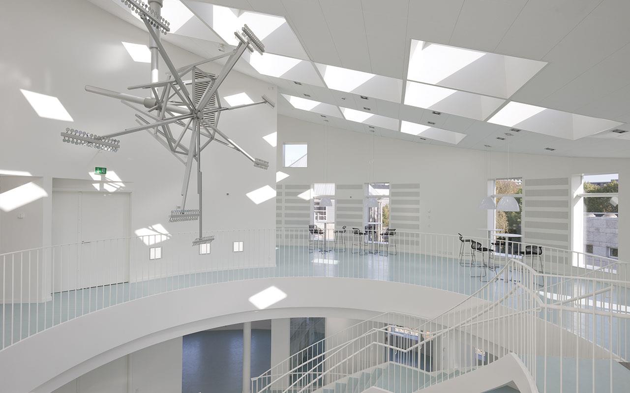 丹麦国家建筑规范里,有一个有趣的规定:每栋公共建筑,可以拿出相当于预算1.5%的资金来做艺术装饰。为此丹麦国家艺术院的两名艺术家,为建筑做了一个名为“仪器”的艺术雕塑,这个雕塑看起来像一个探测器,其主体由8个“手臂”组成,每个手臂上装有30面小镜子。艺术家说,如果天空晴朗阳光灿烂的话,仪器每一个“手臂”上,会在一年内的两天时间里,由两面小镜子投影在中庭的地板上形成一个圆形的光环。