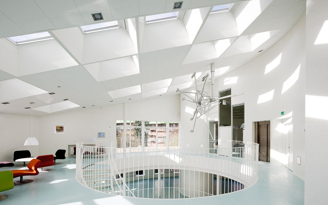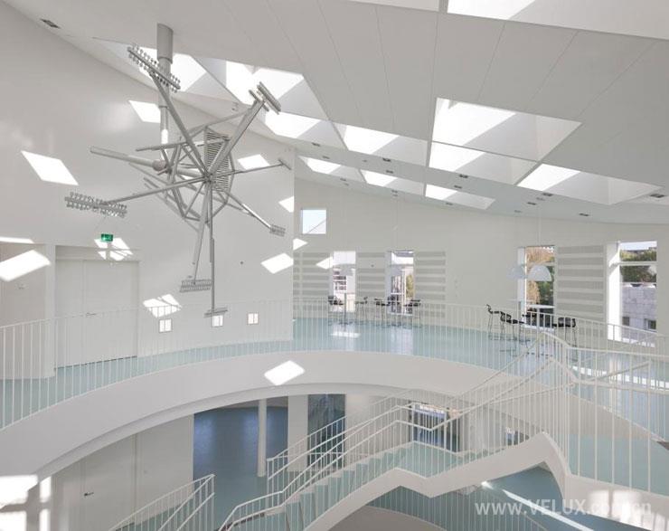 建筑的内部照明以自然采光为主,结合丹麦当地的光气候条件,除了在建筑立面安装了适量的竖窗,还在建筑的顶部,设置了一定数量的智能电控屋顶窗,这无疑给建筑的中庭,带来了巨大的光照度的变化。