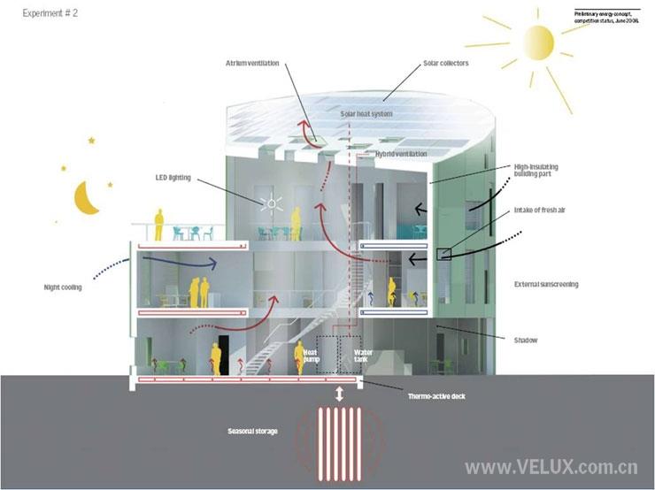 2.良好的维护结构保温性能丹麦地处北欧,气候比较寒冷,建筑良好的保温性能是建筑节能的重要环节。为此,绿色灯塔在外墙设计,门窗选择上花了大量的时间。这里值得一提的是太阳热的采集和防止问题。在夏天,太阳过热是负面的,此时我们需要太阳的光线,却要求把太阳的热量隔绝在室外。而在冬天,我们在需要太阳光线的同时,也需要太阳的热量。因而使用所有时间都是一个传热系数的