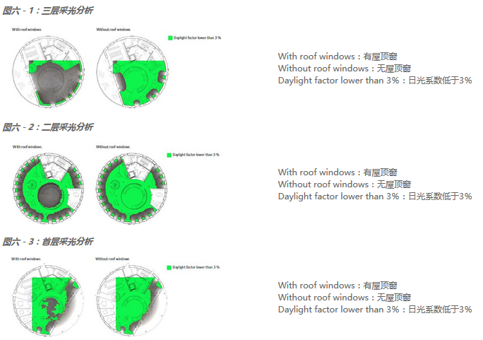 工程师们应用《Daylight visualize》采光软件,对建筑的每一个房间与角落,按全云天、半阴天、晴天等几种情况,对全年的几个标志时间段春分、秋分、夏至、冬至分别进行了计算,对有眩光的部位,及采光系数小于3%的部位,工程师与建筑师进行了反复的设计和比较,直到满意之后才告一段落。