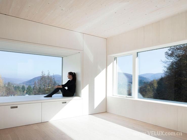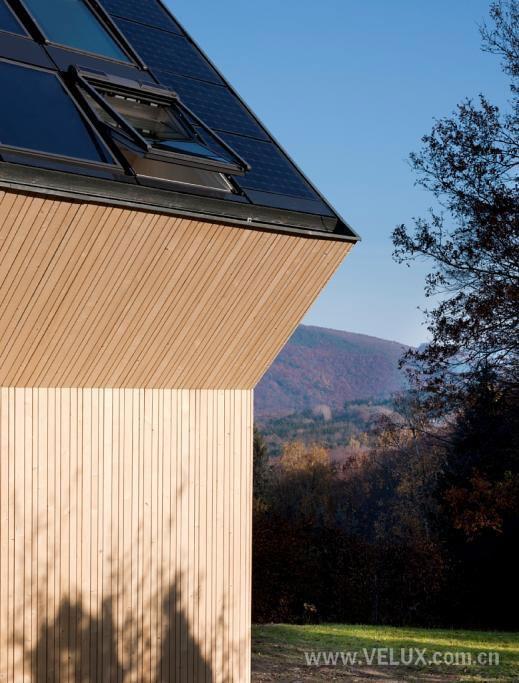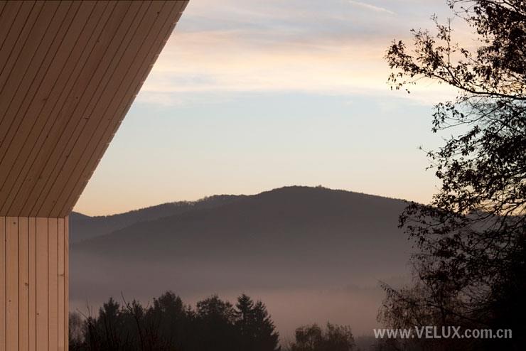 海恩-特洛伊的设计方案完美地呼应了建筑场地特点。通过提升客厅天窗的高度将更多光线引进室内深处,从而消除了附近山峰阴影的影响。