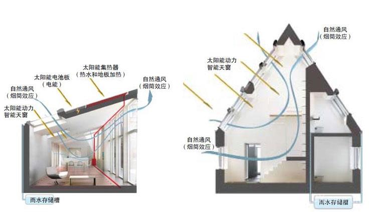 一般情况下, 老建筑改造过程中安装新设备会面临许多复杂问题。LightActive House 很难使用热力回收系统或者机械空气调节设备,建筑师从能耗效率方面考虑,最终选择安装“太阳能动力智能天窗”进行自然通风控制。太阳能动力智能窗系统可以根据室内外温度、CO2 浓度以及空气湿度自动打开和关闭窗户,通风过程充分利用自然因素。窗户打开后,建筑承受的风压和室内外的温度差确保通风过程的实现。窗体安装位置及高度的不同可强化温度差异,导致烟囱效应的形成,利用温度升高时污浊空气会主动上升的原理,使污浊的空气通过屋顶窗散发到室外,温度较低的新鲜空气自动从底部进入室内。