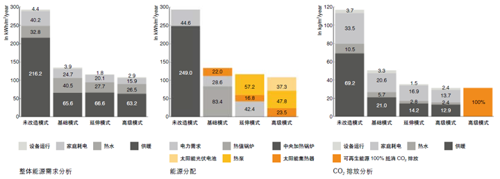 未来建筑应该为用户创造更加健康、舒适的生活环境,同时又不会对气候造成负面影响。因此,LightActiveHouse 致力于利用再生能源自主提供全部所需能源,同时又不会失其高品质生活要素,如日光照明、新鲜空气等。老式建筑总能耗通常都很高,而实现上述目标的前提是确保较低的总能耗,因此这个改建项目面临着十分特别的挑战。为满足《德国节能法案》(Germanenergy-savings directive, EnEV) 规定的标准,在建筑原有的石灰石外墙上加了保温绝缘层,以现代幕墙代替老式窗户,新型预制屋顶结构取代了过去的屋顶。