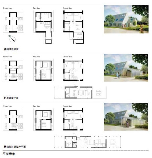 改造设计保持了原有建筑的基本结构,同时采用了模块化延伸模式。模块改造有多种实现方式,可以根据居住者的经济能力、能耗计划和面积扩建需求,对房间自由设计和延伸,所不同的只是面积大小、材质和建筑技术等问题。