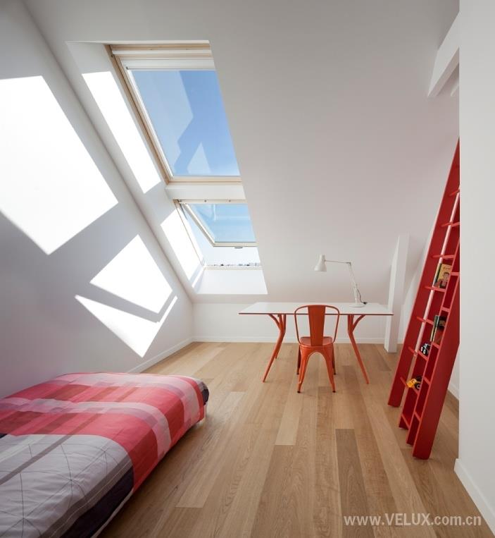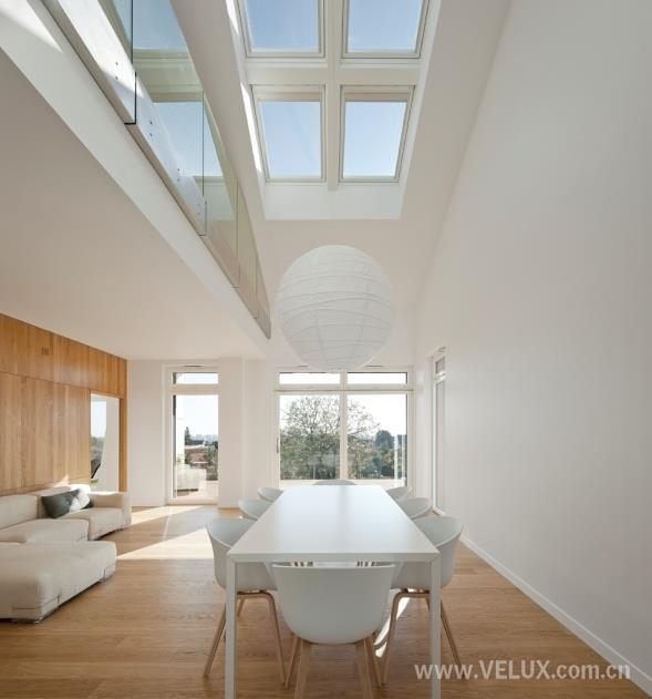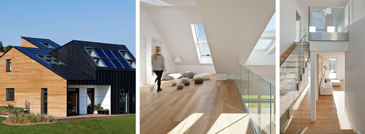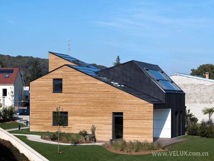 在中间位置朝南的两个斜坡屋面上,安装了威卢克斯的太阳能智能动力天窗(无需布线),同时也为太阳能集热板和太阳能光伏板最大可能获取太阳能量提供最佳安装角度。斜屋顶不只是一个保护屏障,而且是房子的第五立面,在优化能效和整体建筑美学方面发挥关键作用。