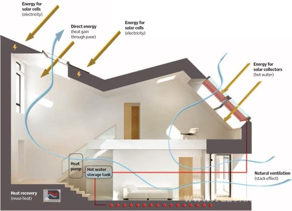 能源设计方面是利用可再生资源(包括太阳能、自然采光和自然通风),以实现降低夏季空气调节能耗,降低冬季取暖和人工照明。人工照明、家用电器和多媒体设备都以低能耗为基础进行挑选。此外,为了降低电耗,洗衣机和洗碗机可以直接连接到冷热水龙头上。