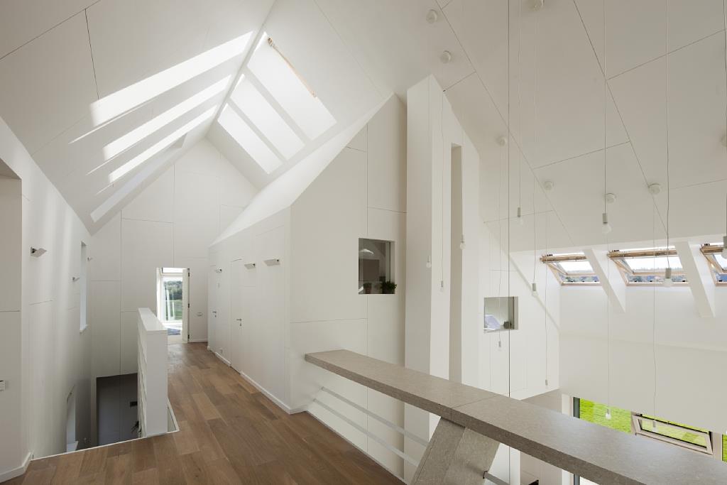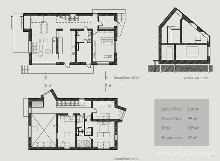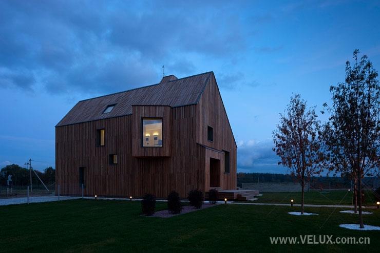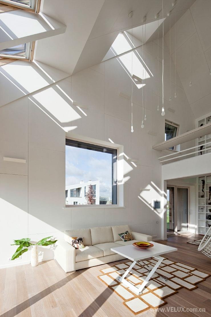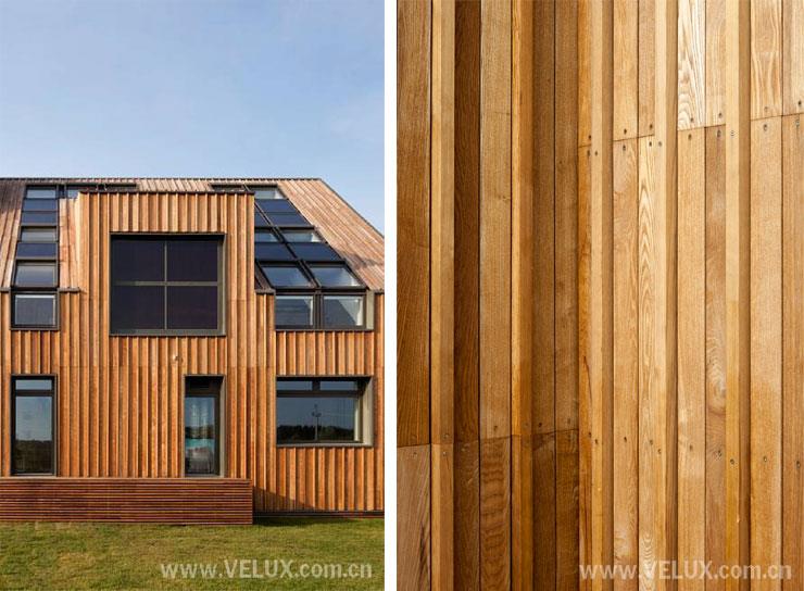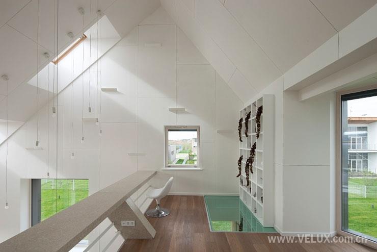 从房屋设计上来看,Active House传统理念通过现在手段得以体现,彰显了其独特魅力。房屋布局兼顾了功能性和特色性。规则的建筑平面满足了斜坡屋顶和建筑高度翻番的要求。建筑特色体现内与外的关系,展示形态与光照的相互作用。通过威卢克斯屋顶窗的策略布置,当人们从一个房间进入另外一个房间,可以感受环境带来的独特美感,可仰望清晰的天空景象。