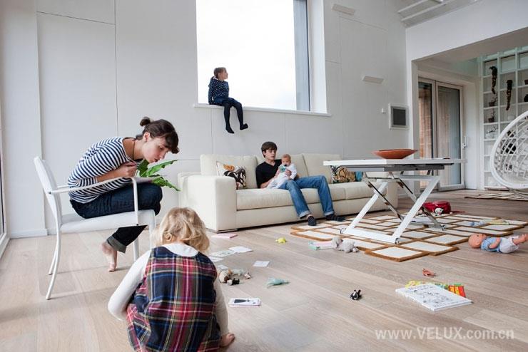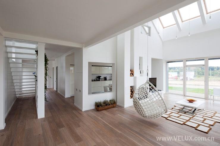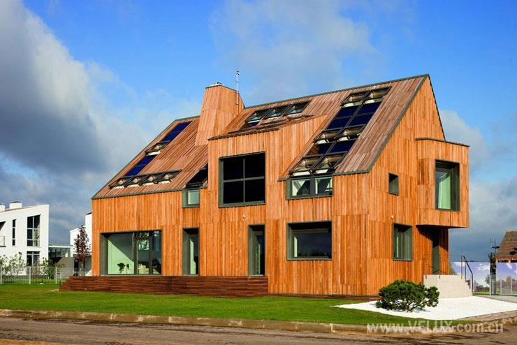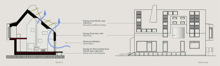 建筑的南侧立面和斜坡屋顶在智能采光设计中占有非常重要的地位。精心布置的屋顶窗和立面窗,以及集成的威卢克斯太阳能集热器可以充分利用太阳提供的免费能源。