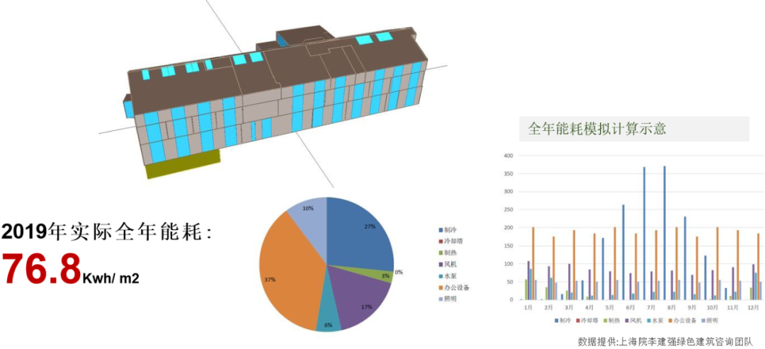 1、 由于园区内没有燃⽓供应,⽼建筑也不具备采⽤太阳能、地源热泵等能源⽅案,在电能成为唯⼀能源供给的情况下,为了节省⽤电量,我们选择了空⽓源热泵作为地暖和空调设备主机的能源供给。同时采⽤分区域智能控制系统来监测和管理能源的使⽤状况。H18在2019年全年能耗为76.8Kwh/ m2。