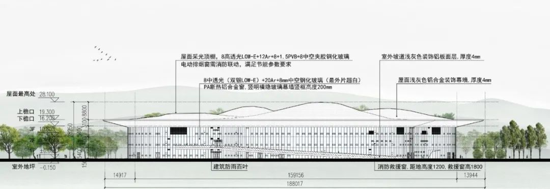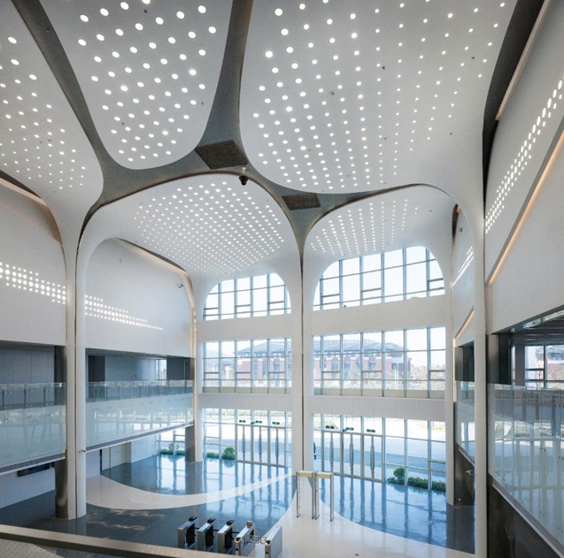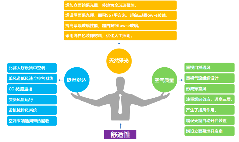 一是非常重视自然采光,增加立面的采光量,采用三层通高的全玻璃幕外墙;增设屋面采光顶,面积达到 了967平方米,约为室内地面面积的7%;提高幕墙玻璃性能,超白双银low-e玻璃;采用浅白色装饰材料,优化人工照明。