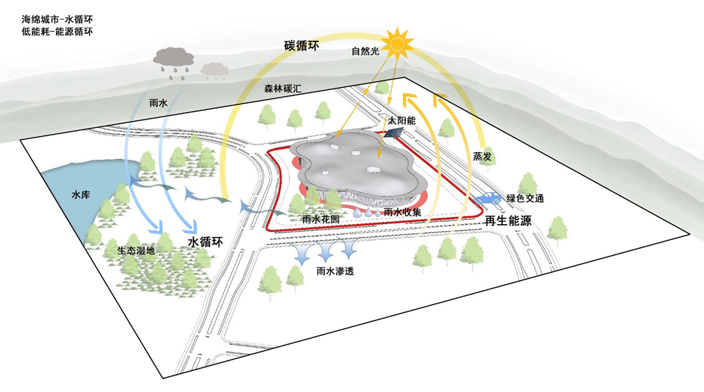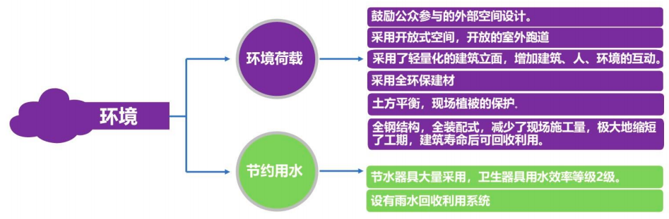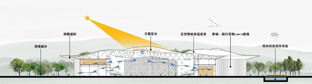 执行海绵城市设计,采用透水铺装,下凹式绿地,及雨水调蓄池;采用全环保建材;土方平衡,现场植被的保护。重视节约用水,节水器具大量采用,卫生器具用水效率等级2级。设有雨水回收利用系统,雨水收集池蓄水容积600m³。全钢结构,全装配式,减少了现场施工量,极大地缩短了工期,建筑寿命后可回收利用。