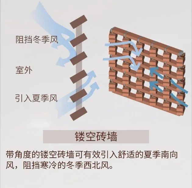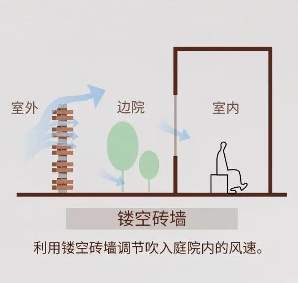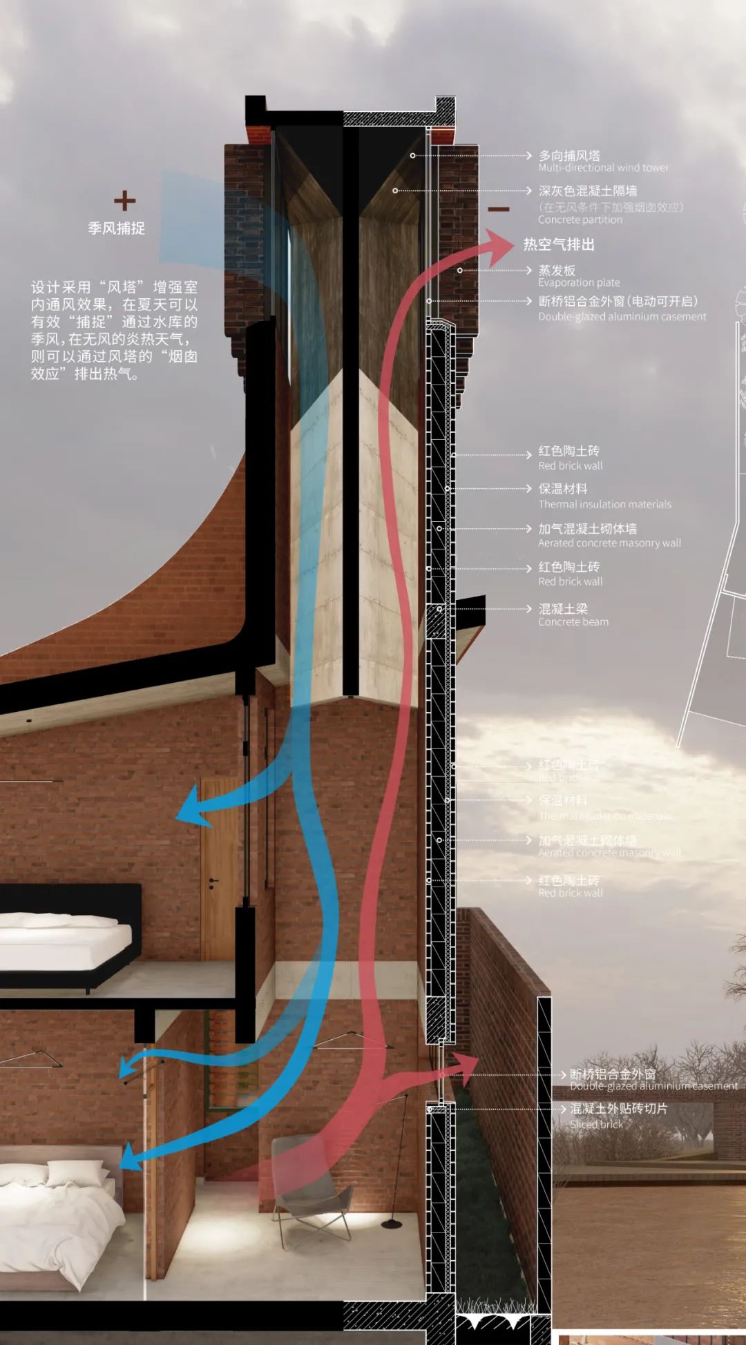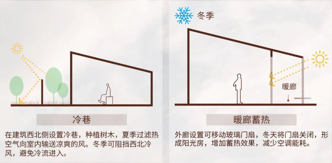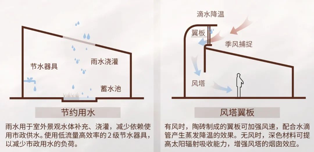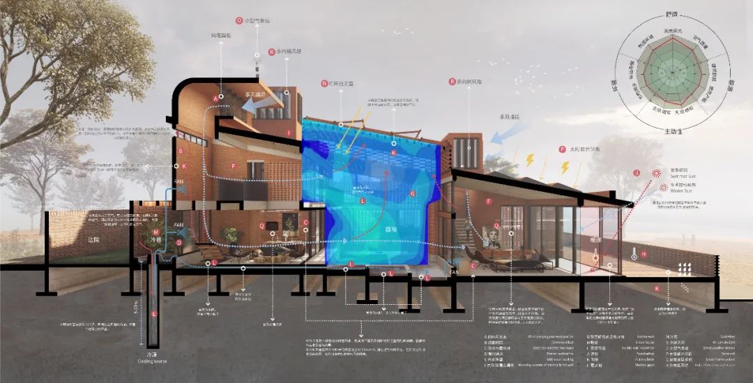 建筑核心区域设计一处中庭,中庭内部均匀布置若干水院(夏季为水院、其他季节将水放干)和草地,夏季,水院中的水通过蒸腾作用,吸收空气中的热量,草坪根据季节特点种植薄荷等防蚊虫植物,两者相互作用,形成建筑内部的气候缓冲区,结合建筑场地外的水院、绿地等,整个建筑似乎生长于自然环境之中,体现“自然营造”的特点。