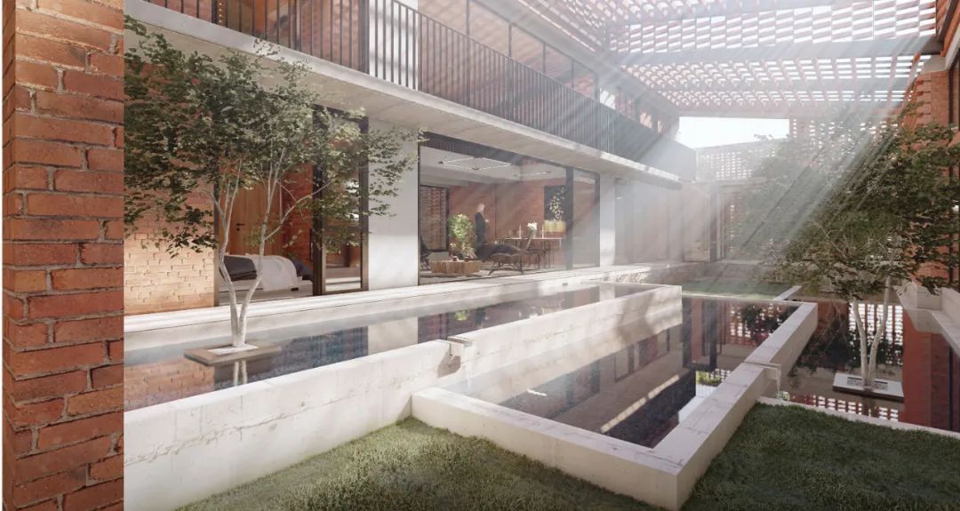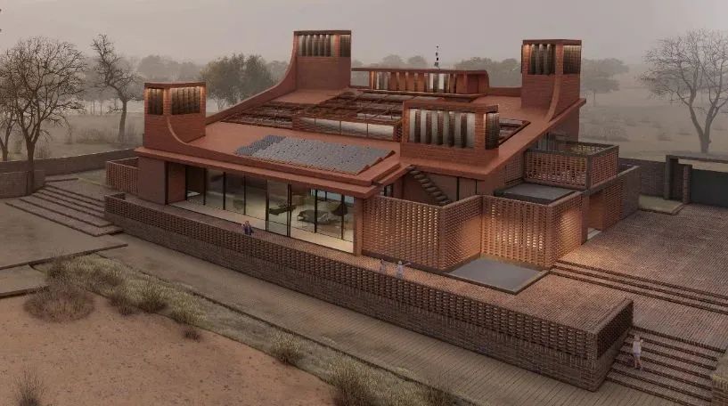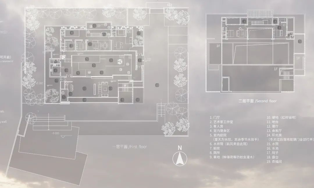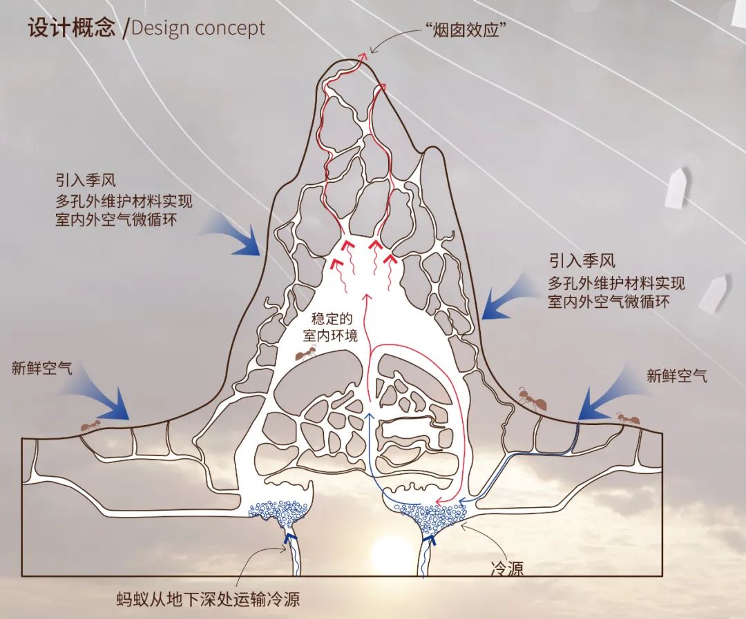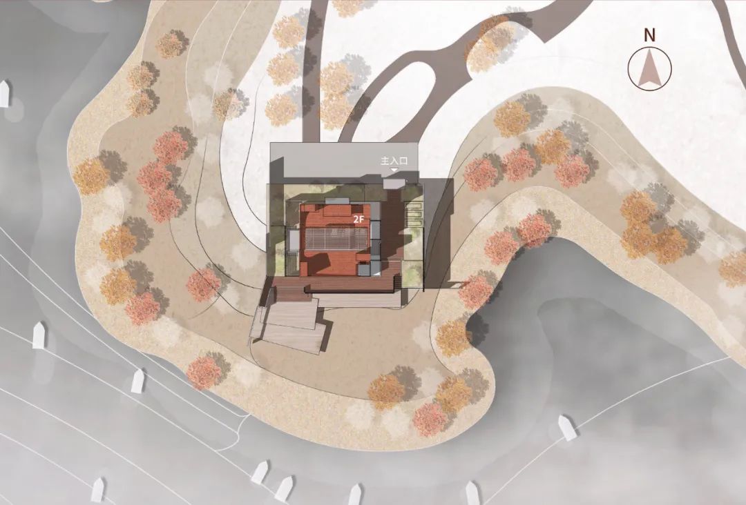 建筑核心区域设计一处中庭,中庭内部均匀布置若干水院(夏季为水院、其他季节将水放干)和草地,夏季,水院中的水通过蒸腾作用,吸收空气中的热量,草坪根据季节特点种植薄荷等防蚊虫植物,两者相互作用,形成建筑内部的气候缓冲区,结合建筑场地外的水院、绿地等,整个建筑似乎生长于自然环境之中,体现“自然营造”的特点。