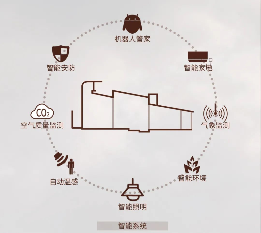 建筑配置全宅智能家居系统,融合全生活场景、八大功能系统、多种交互方式、实现全宅智能。系统监测的参数包括:室内温湿度、CO2浓度、PM2.5、VOC、噪声等,空气质量传感器设置于一层门厅内,与新风设备联动控制,主动感知室内空气污染物浓度,超标时启动新风系统,使全屋24h都有洁净空气。