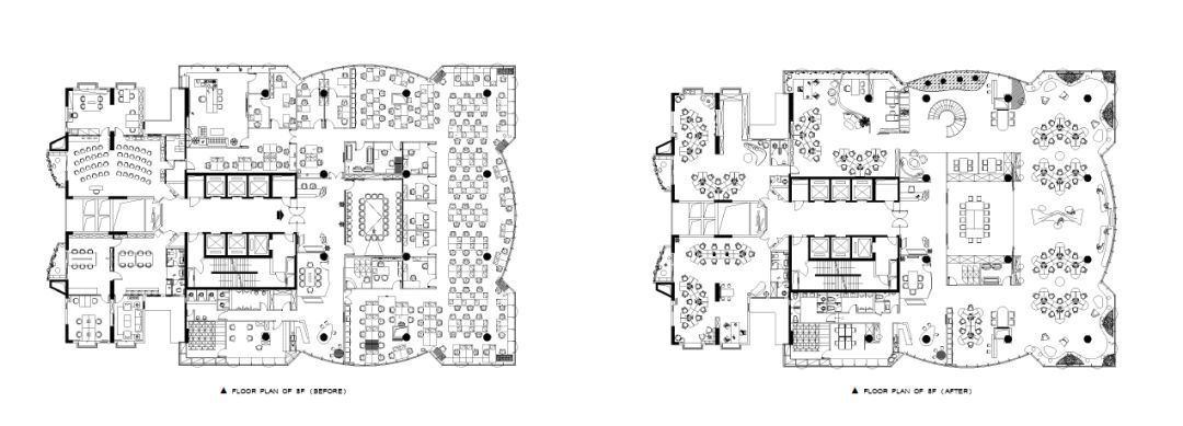 改造后的办公固定座位变少,同时在室内也添加了更多“非正式”会议点,办公室均呈现开放式状态,撤销了大部分私人办公室,有利于营造一种轻松、包容的工作氛围。