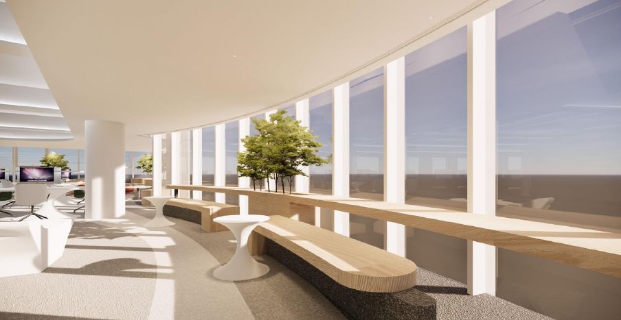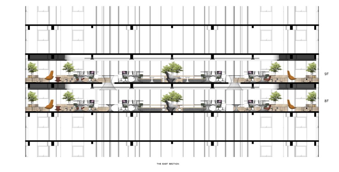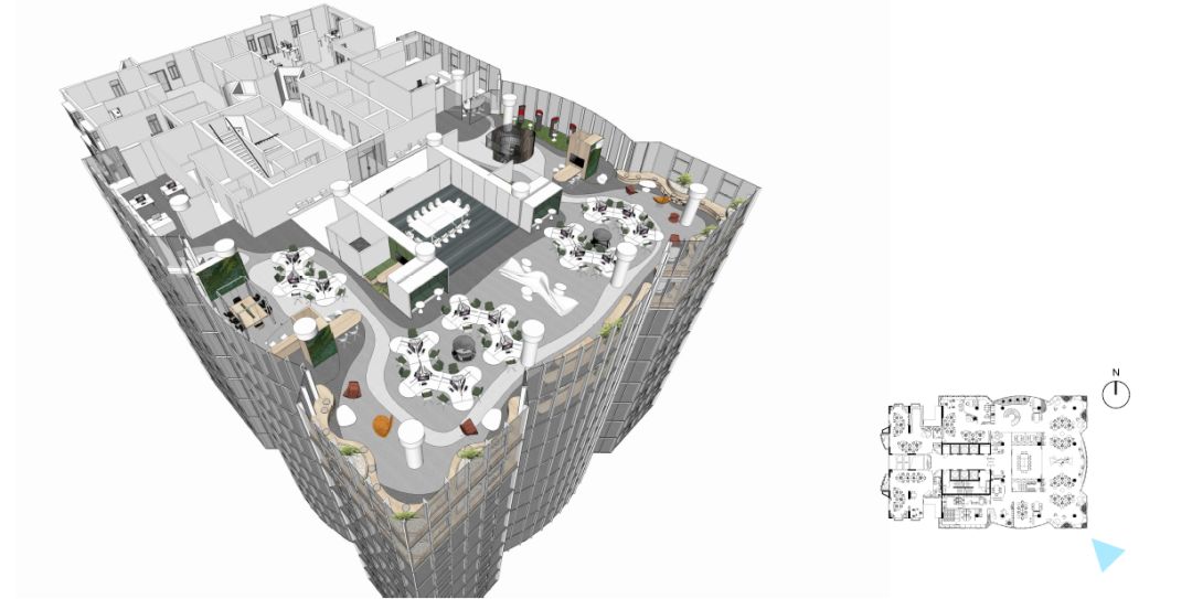 3.由于办公场所不在建筑物最顶层,因此无法通过景观设计收集雨水,也无法将透过幕墙进入室内的热量从顶部带走;