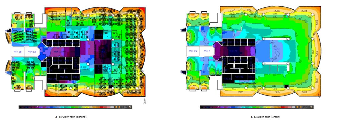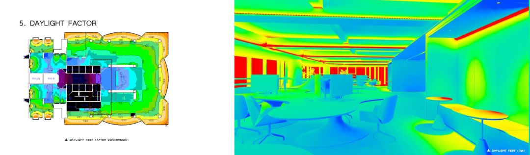 由于自然采光得到了优化,希望能有效减少对人工照明的依赖。办公桌面照明采用人性化设计,可以根据用户的行为习惯和喜好调节亮度和高度。整个空间在运用漫反射的手段同时,还采用二次反射照明,使室内空间的气氛变得更加柔和,避免令人眼花缭乱。