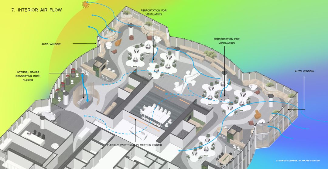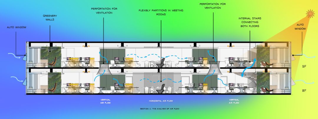 共享工作的新空间模式打破了原有的物理屏障,让室内空间被彻底打开, 自然光线在办公室内得到了更好的流动,让室内空间显得更加清透明亮。会议室的灵活分隔促使气流水平流动,使用旋转楼梯打通两层楼的连接,促进了空气的垂直流入,创造了更好的室内通风。