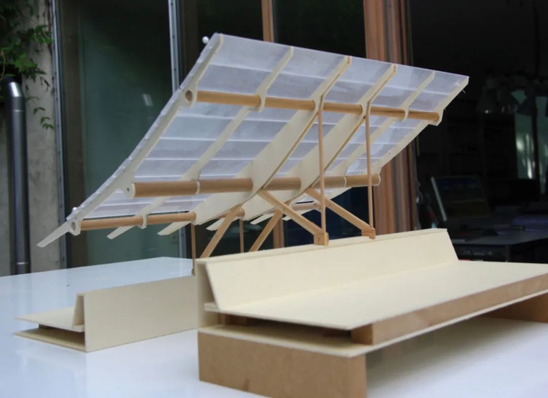 在大进深处有规律地使用可开启天窗,兼顾通风与采光双重需求。为保证更好的通风效果,我们在天窗上设置了白色张拉膜,张拉膜与天窗之间产生的文丘里效应,有利于提高通风效率;为保证自然光最大化地进入室内,我们在屋面之上使用了反粱;