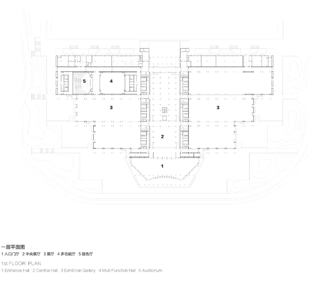长江文明馆是三年一度的中国国际园博园(武汉)的主体建筑,建筑面积3.23万平方米。我们将建筑在南北方向结构跨度设计为25米+5米+25米+5米+25米的秩序,在5米跨度的交通部分设置可开启式天窗,既解决采光问题,又兼顾部分自然通风;鉴于不需自然采光的展览区域能耗不大,加之该博物馆用地宽松,周边几乎没有其他建筑,我们有针对性地使用了地源热泵技术。