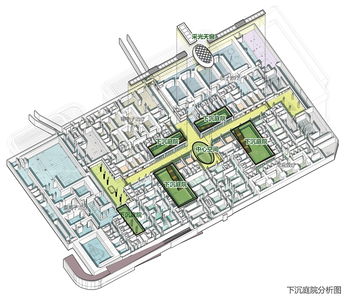 射线肿瘤治疗装置的核心在地下一层,项目设计通过在广场设置下沉庭院和采光天窗、在建筑内部设置采光中庭的方式,保证地下50%以上的公众及医护使用的空间有天然采光及通风。地上部分除装置辐射防护区及其设备机房因工艺要求无需采光外,绝大部分均能自然通风并采光。高层塔楼通过建筑设计上的体型错位增加了建筑的采光通风有效界面,并减小了建筑进深,有效提升采光通风效果。项目设置了固定可调节的内外遮阳装置,且所有房间不舒适眩光指数均满足标准值要求。
