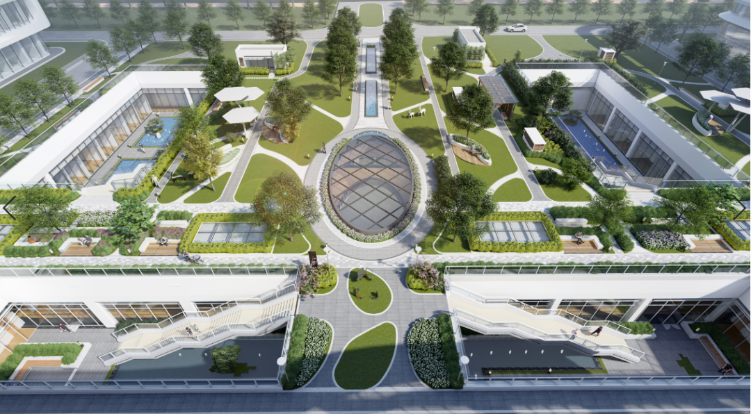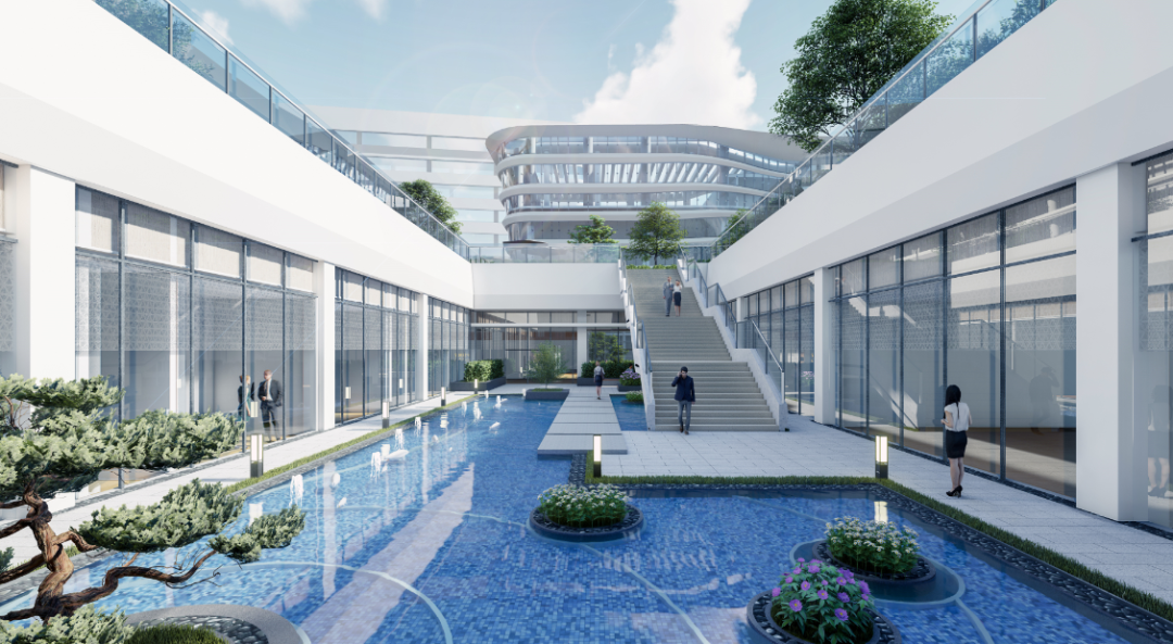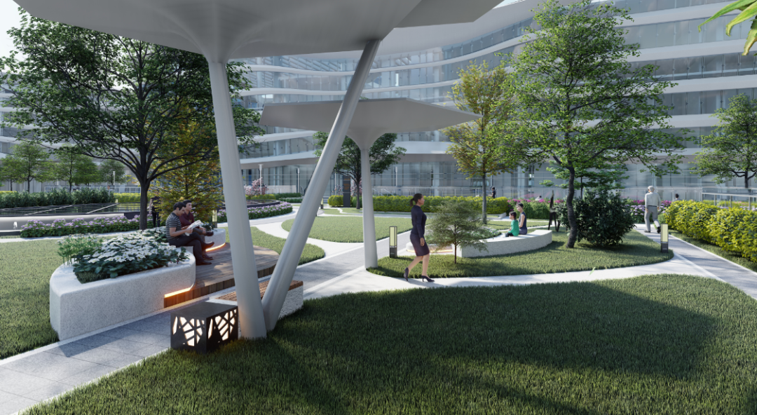 园林景观设计以“生命之树 疗语花香”为设计主题,通过空中绿化平台、地面景观广场和地下景观庭院的景观体系,为医患提供了多层次的康复场所和休息场所,树状的园路设计结合景观小品、庭院绿化,为患者康复提供了康复运动的空间。