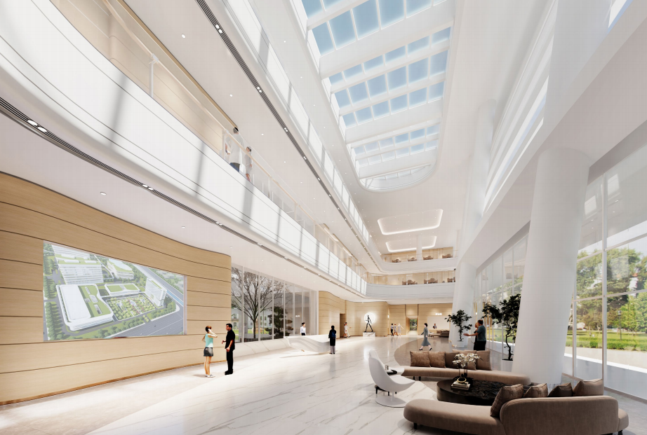 项目设计充分满足各年龄段和无障碍的需求,诸如公共服务大厅、公共休息区和展厅等空间采用了适应多功能需求的设计,除辐射防护区内的隔墙均为装配式隔墙,适应未来建筑功能变化的可能性。设计强调建筑、景观和装修一体化,设置空中绿化平台、地面景观广场和地下景观庭院多层次的园林体系,为使用者亲近自然环境创造更多机会。