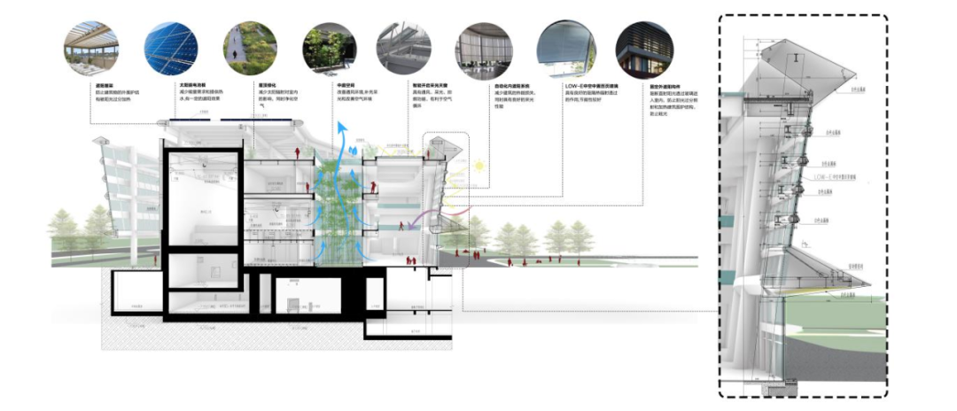 强调固定外遮阳、可调节外遮阳、高反射性的内遮阳组合遮阳体系,通过屋顶太阳能构架、屋顶绿化系统减少太阳辐射对室内环境的影响。屋顶主要强调屋顶覆土绿化和遮阳构架隔热、立面上是外倾斜的立面自遮挡和象牙白立面材料对光热的反射,外墙采用了LOW-E中空玻璃,中置遮阳百叶。
