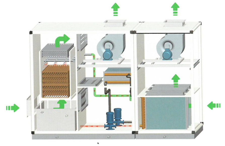 重离子治疗室采用温湿分控空调系统,新风系统独立设置,主控治疗室相对湿度,每个治疗室设置多联机,主控室内温度。新风处理机组采用组合式,功能段包含进风段、粗效过滤器(G4)、中高效过滤器(F8)、表冷段、加热段,送风段等。治疗室设新排风热回收,对室外新风进行预冷处理,节约能源。