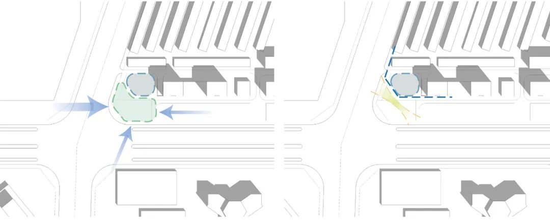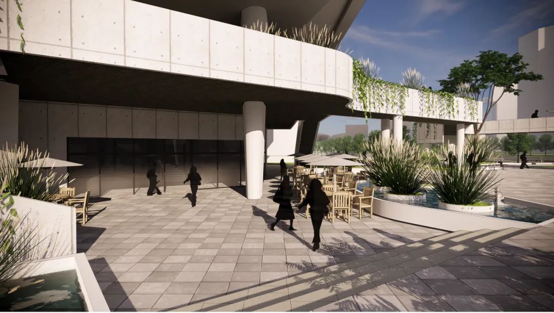 建筑采用底层架空设计,退让空间于城市,使建筑及其配套广场、景观及绿化能够成为市民休闲娱乐活动的理想场所。退让形成的灰空间,结合水体设置能够改善建筑出入口微气候环境。建筑总体功能布局,将配套空间及附属空间布置于建筑北侧,形成缓冲,避免冷风渗透。