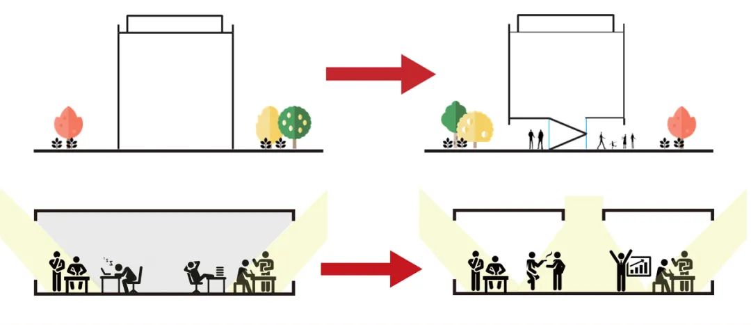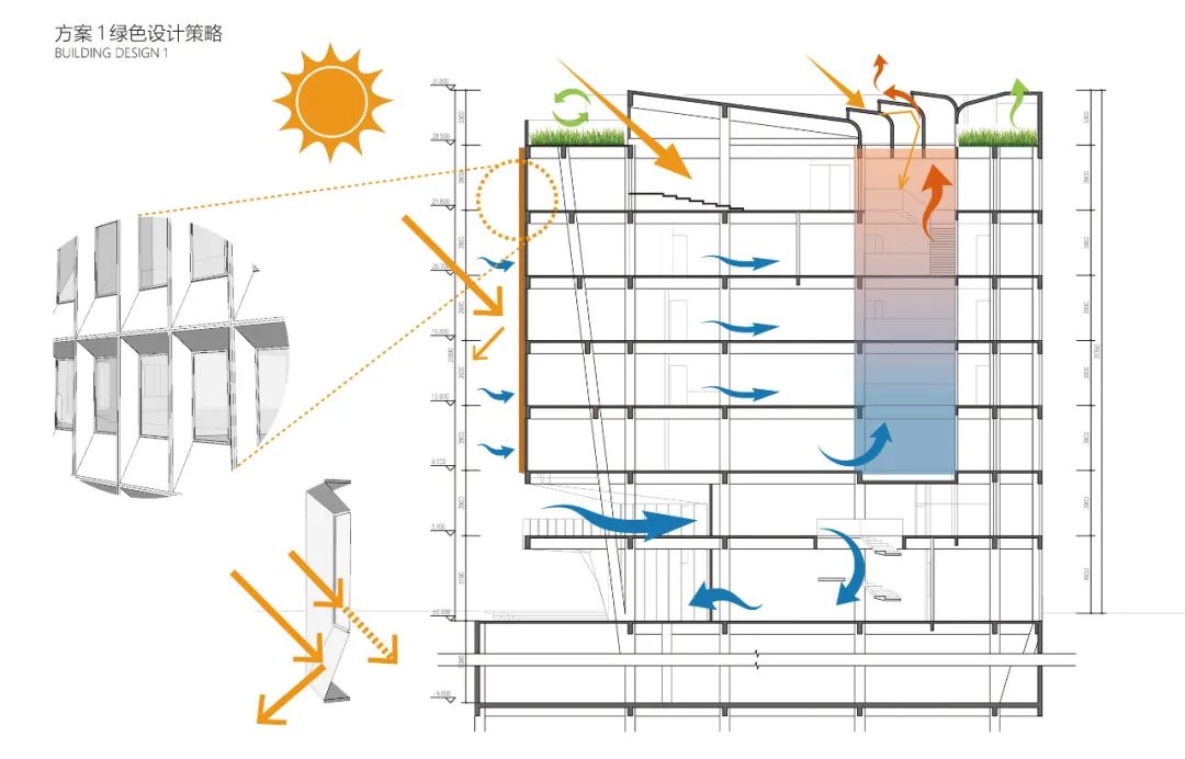 建筑内部设置中庭空间,改善室内光环境、提升室内照度及照度均匀度。提升办公空间舒适性。中庭顶部天窗可根据天气及季节变化开启或关闭,开启后利用文丘里效应,增强室内通风。关闭后形成蓄热空间,提升室内温度。窗洞采用凹陷设计,形成自遮阳,减少太阳热辐射对室内环境的影响。