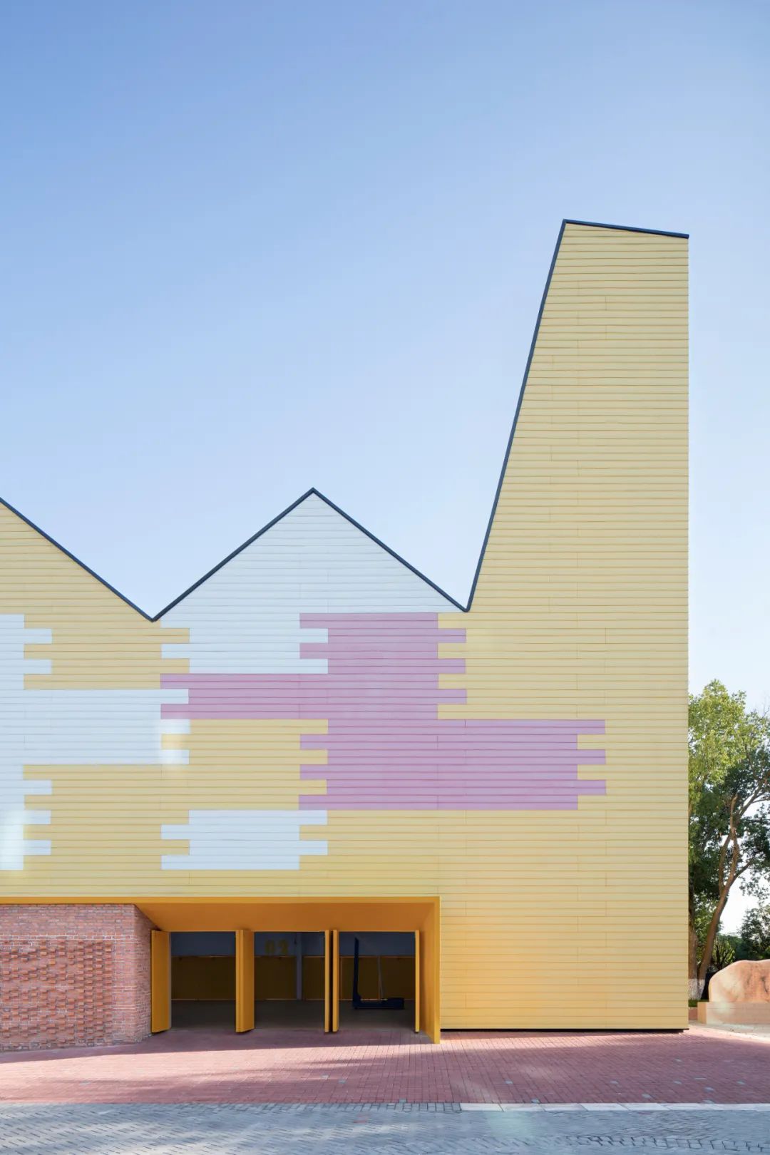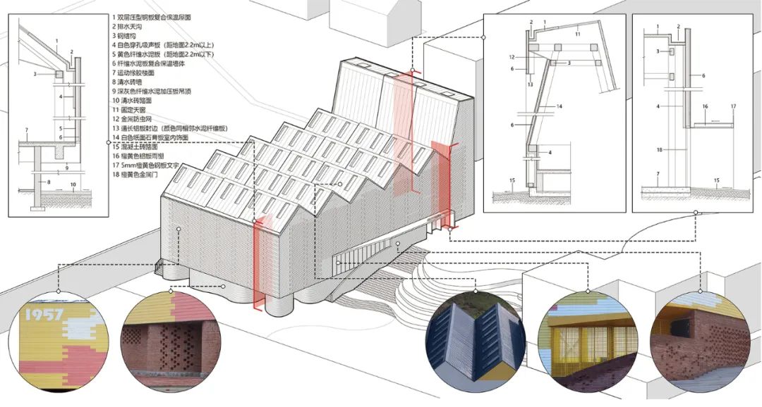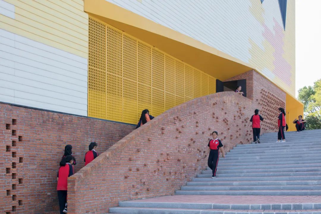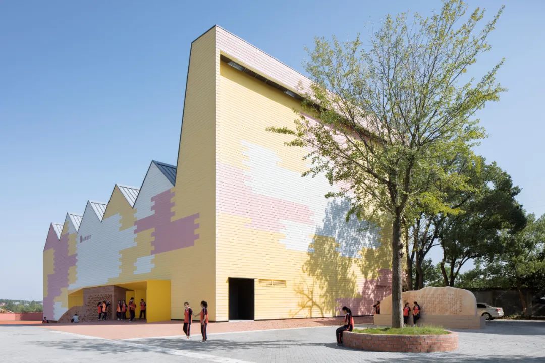 结合红砖场地及墙体,把带有手工工艺特征的红砖砌筑与工业化产品一体化设计,利用手工艺带来的自由和艺术感适当中和工业化建筑的机械和单调,例如,利用传统花式砌砖方式,形成红砖墙面的采光通风洞,以及将十二星座图融入砖墙凹凸设计。主体建筑的色彩图案设计,则来源于岳阳地形的山水平原分布图的抽象,作为学校建筑,为孩子们提供更加丰富且有趣的内容,增加互动。