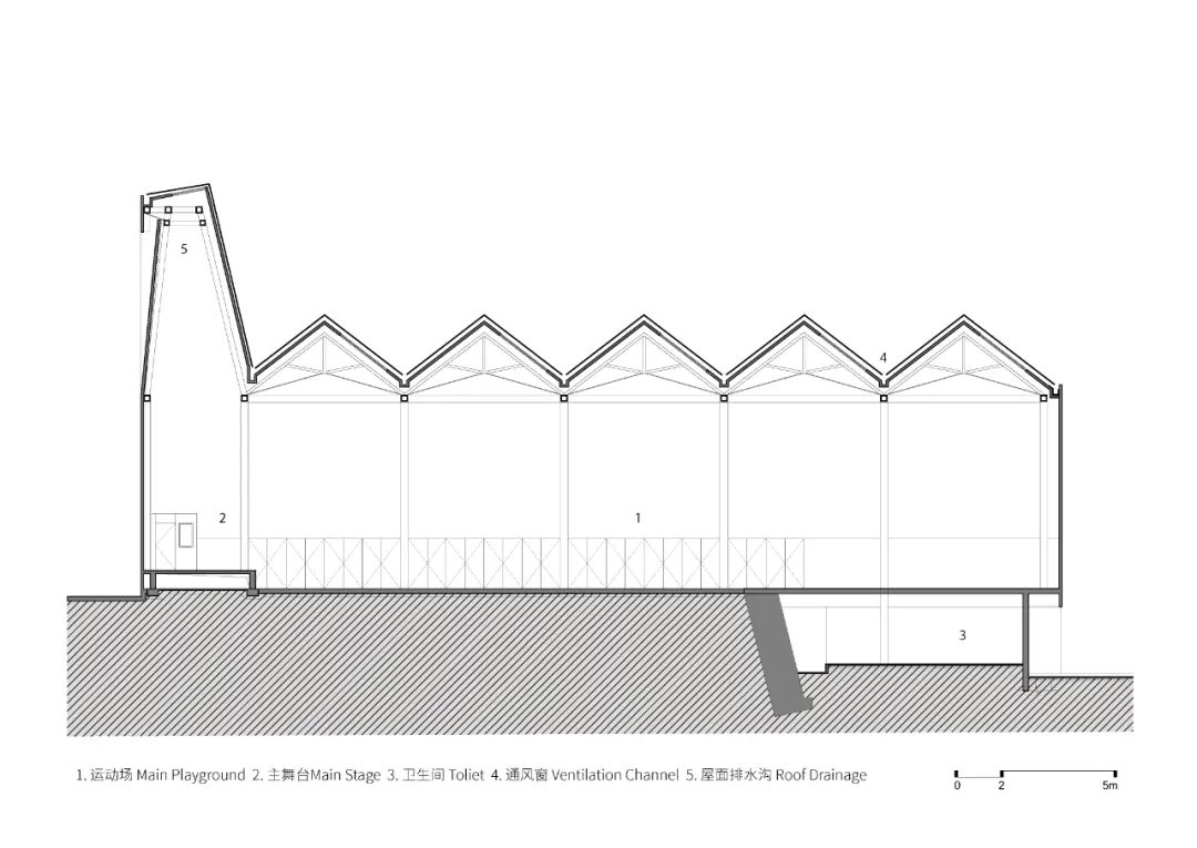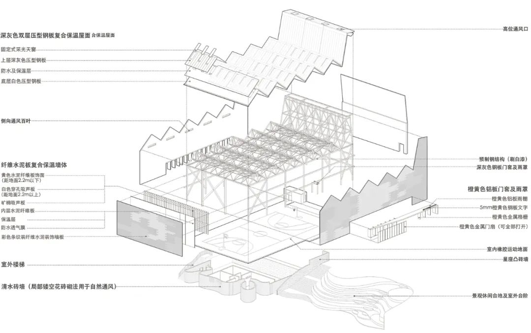 为尽量减少施工过程对校园的影响,结合地势高差,建筑采用了现浇结构和工厂预制混合设计的策略。底部延续现有高差的毛石挡土墙,采用钢筋混凝土和红砖的传统现场施工方式,上部主体空间则采用预制装配式的钢结构和围护墙体及屋面。