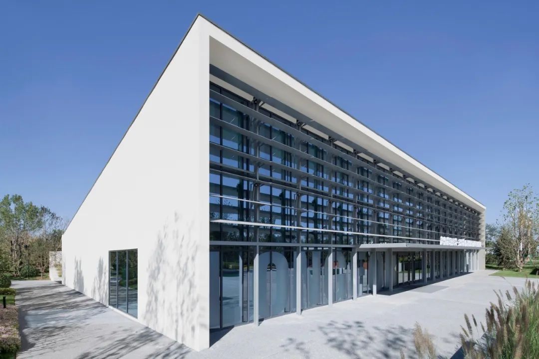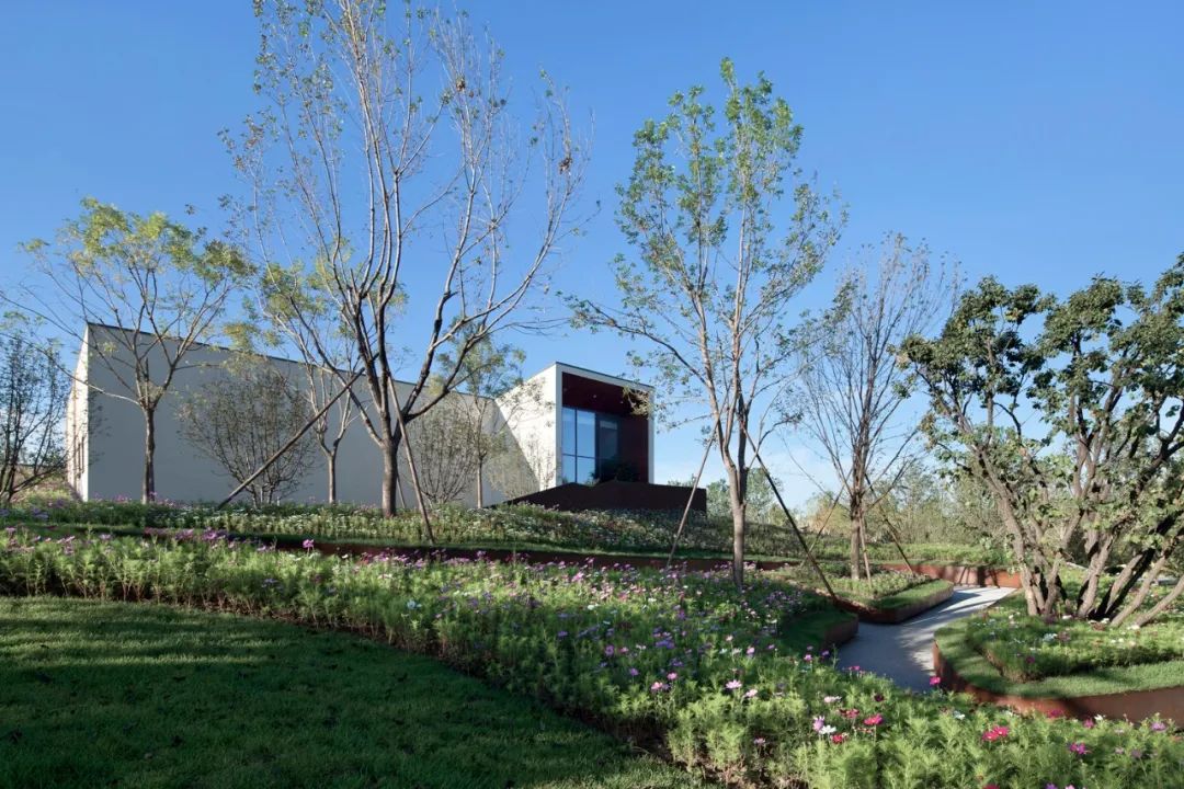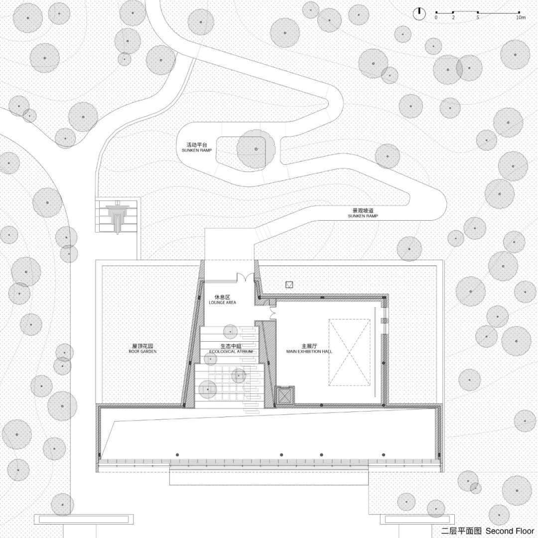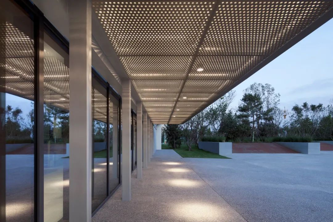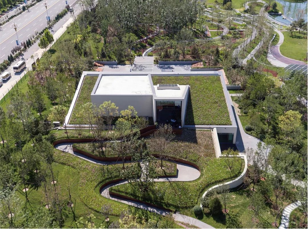 项目借助建筑景观一体化的设计,在避免造型冷桥的同时丰富室内外空间体验。整体南高北低,高空间是展厅,低空间是服务和设备间。