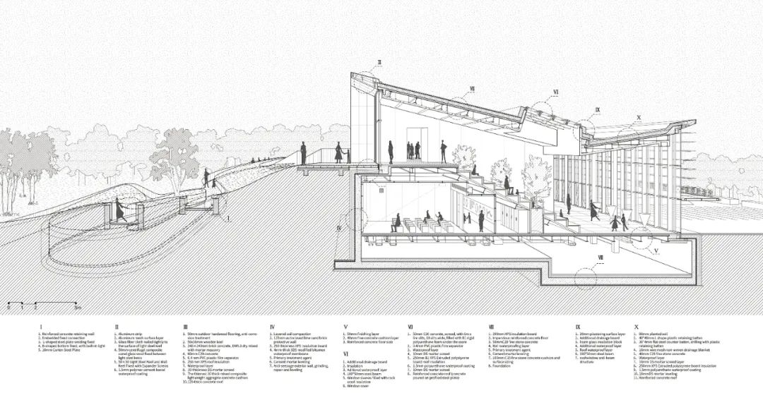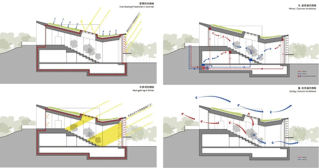 考虑到被动房对供暖能耗的限制和对保温的要求,结合“消隐于环境”的设计初衷, 将建筑北侧压低到景观土坡里, 与场地改造后的微地形连为一体,而南侧则利用全玻璃幕墙在冬季最大可能的搜集太阳的辐射热。从技术上实现了借助覆土的北侧保温和减少外墙散热,同时也减少了采暖空间体积,以此替代了常规的外围护技术策略。