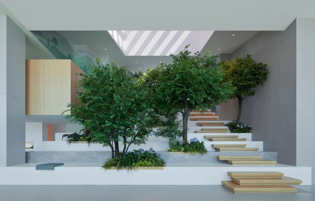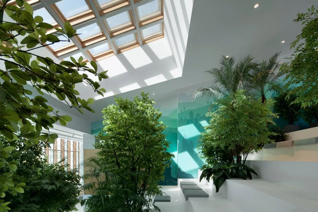 带有大天窗的楔形的中庭,结合了绿植与休闲区,既能居高临下的面南观景,又能通向北侧二层户外草坡。成为自然与人工环境的枢纽。