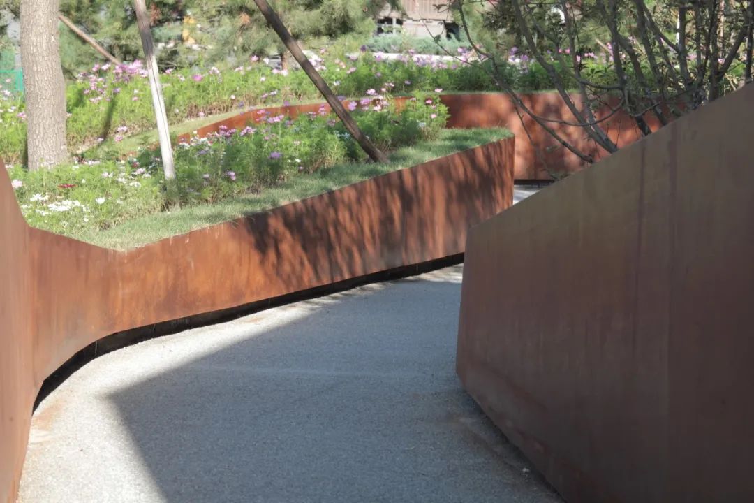 西北侧的雨水花园引入了屋面和土坡局部的雨水径流,灌溉层层台地后引入小院,在雨水回用的同时,成为一处对景。